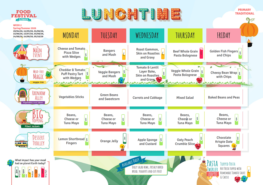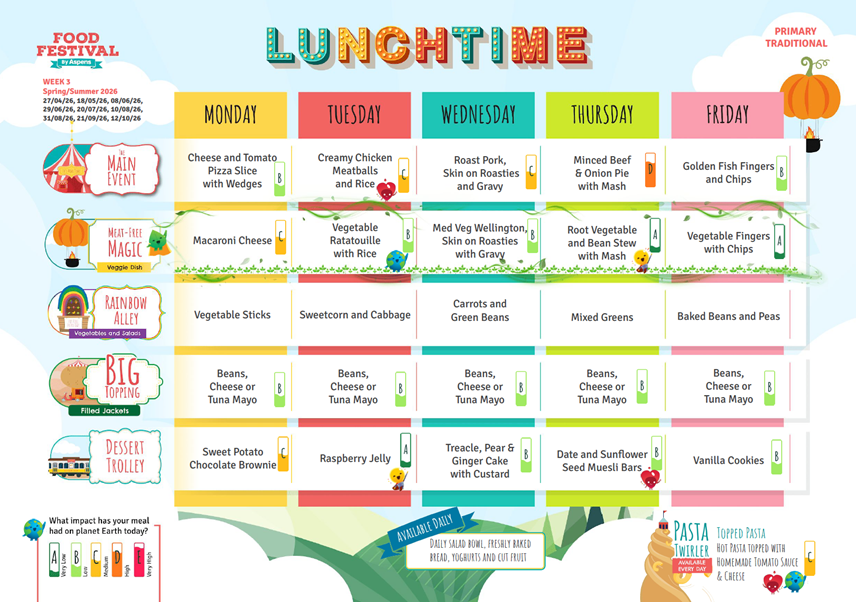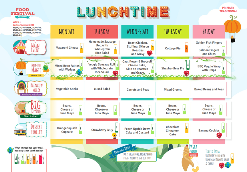 Our school lunches are provided by Aspens, who deliver them daily from St Egwin’s C. E. Middle School in Evesham. The Aspens menus are on a three-week cycle. Bookings should be made via Swiftkitchen for both paid lunches and free school meals. Bookings can be made up to 9am on the morning for that day.